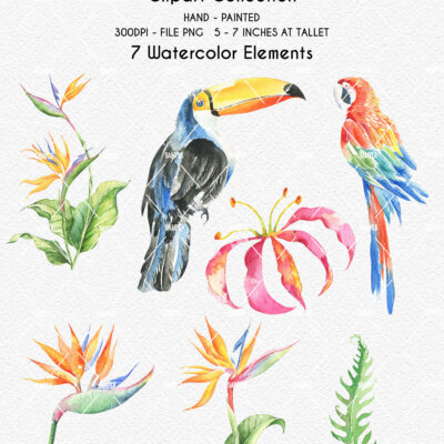 This set of high-quality hand-painted watercolor “Macaw Clipart”