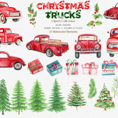 Watercolor Christmas Truck, Christmas Truck Decal, Watercolor holiday, Pine Tree, Retro Car, Christmas Truck, Santa, New Year decoration | WCCHT_02