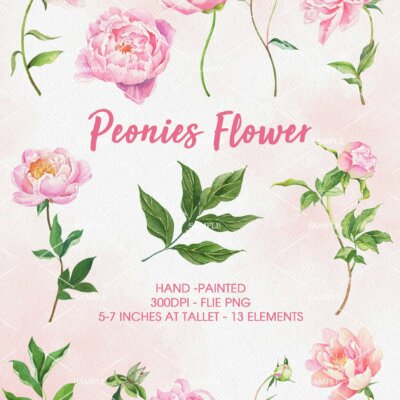 This set of high-quality hand-painted watercolor “Peonies Clipart”