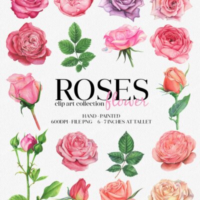 This set of high-quality hand-painted watercolor “Roses Flower Clipart”