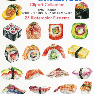 This set of high-quality hand-painted watercolor “Sushi Clipart”