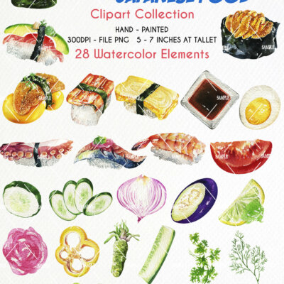 This set of high-quality hand-painted watercolor “Sushi Clipart”
