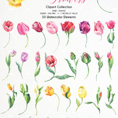 This set of high-quality hand-painted watercolor “Tulip Clipart”