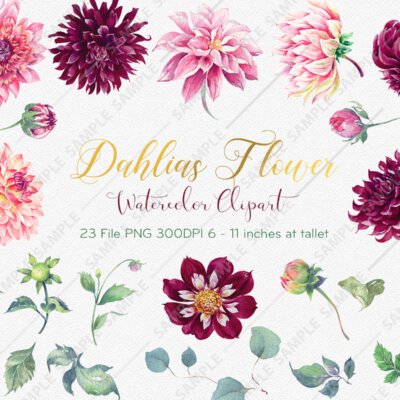 This set of high-quality hand-painted watercolor “Dahlias Marsala Clipart”