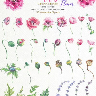 This set of high-quality hand-painted watercolor “Poppy Clipart”