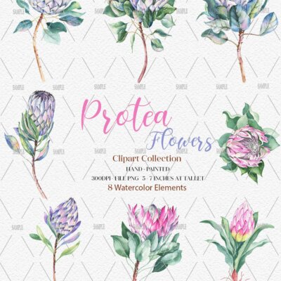 This set of high-quality hand-painted watercolor ” Protea Flower Clipart”