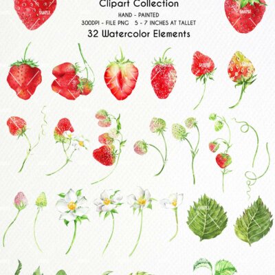 This set of high-quality hand-painted watercolor “Strawberry Clipart”