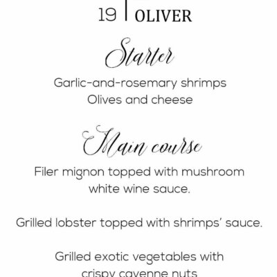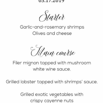 6. Content of the menu (If you have any files for this content, please send them to me via email): (1) Starter, (2) Main Course, (3) Dessert