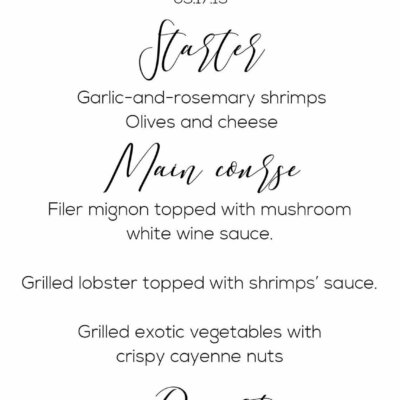 6. Content of the menu (If you have any files for this content, please send them to me via email): (1) Starter, (2) Main Course, (3) Dessert
