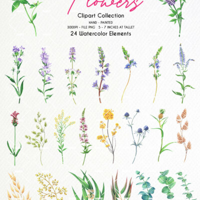 This set of high-quality hand-painted watercolor “Wild Flowers Clipart”